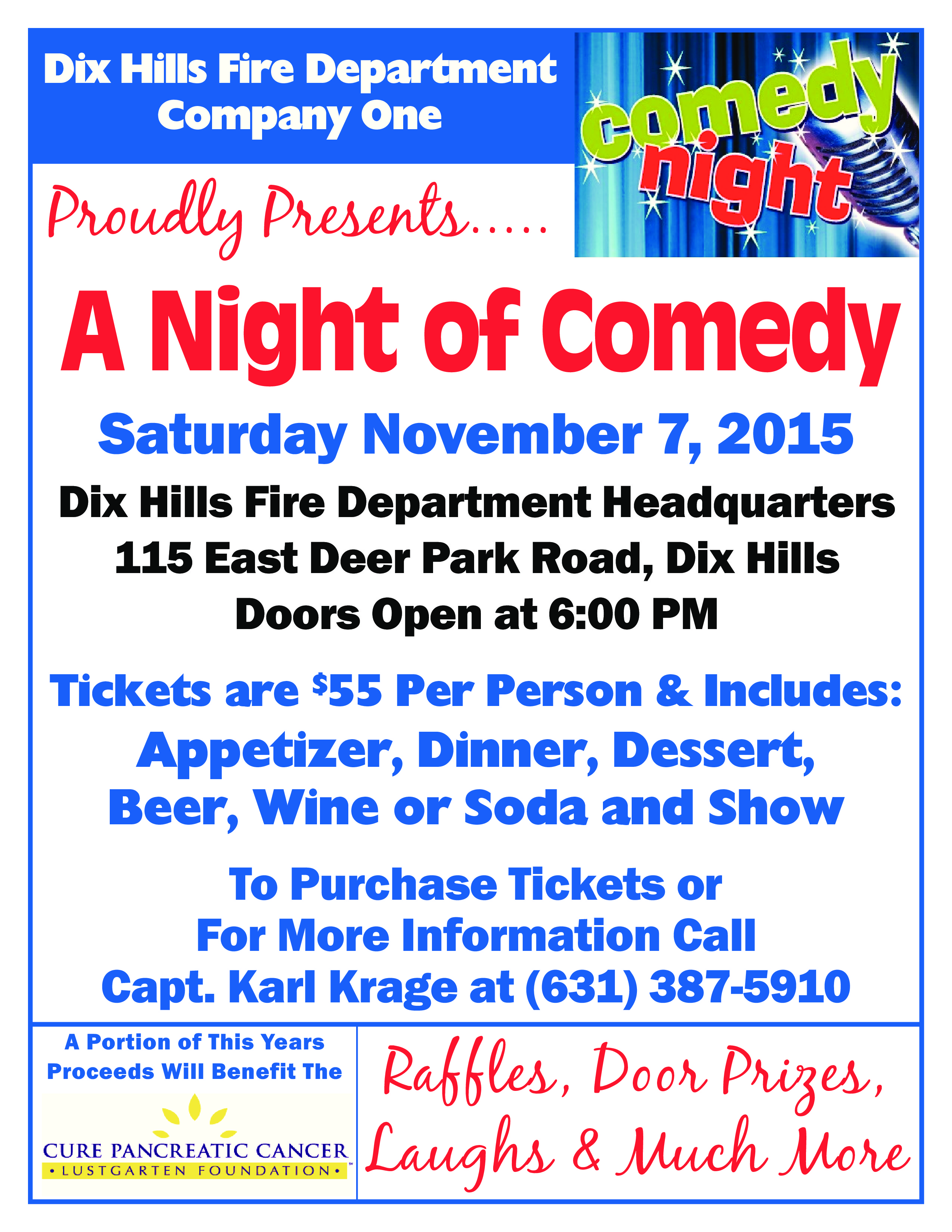 The Dix Hills Fire Department Company One is hosting a fundraiser Comedy Show on Saturday, November 7, 2015. The Night of Comedy will feature three headline comedians that have appeared on various television shows.