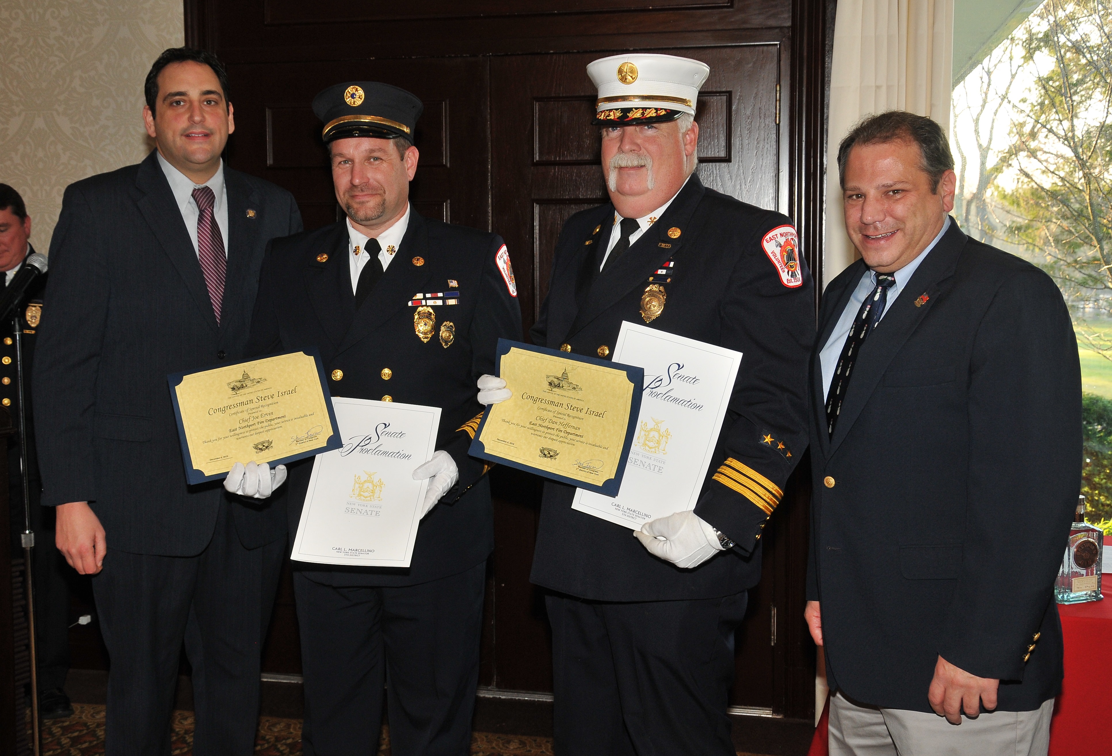 In a letter nominating Ervin and Heffernan for Fire Chief of the Year, First Assistant Chief Wayne Kifler, Jr. wrote that the “extreme effort that both Chiefs displayed in entering the house to search for a victim” merited the recognition. Lupinacci and Raia celebrated the men during the annual Town of Huntington Fire Chiefs Council dinner on December 6.