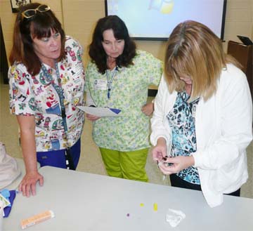 Photo caption: At a large-scale opioid overdose response training, school nurses from the Middle Country School District, Left to right- Gail Breslin and Ruth Conte observe as colleague Marilyn Sint assembles a naloxone syringe with mucosal atomizer device.