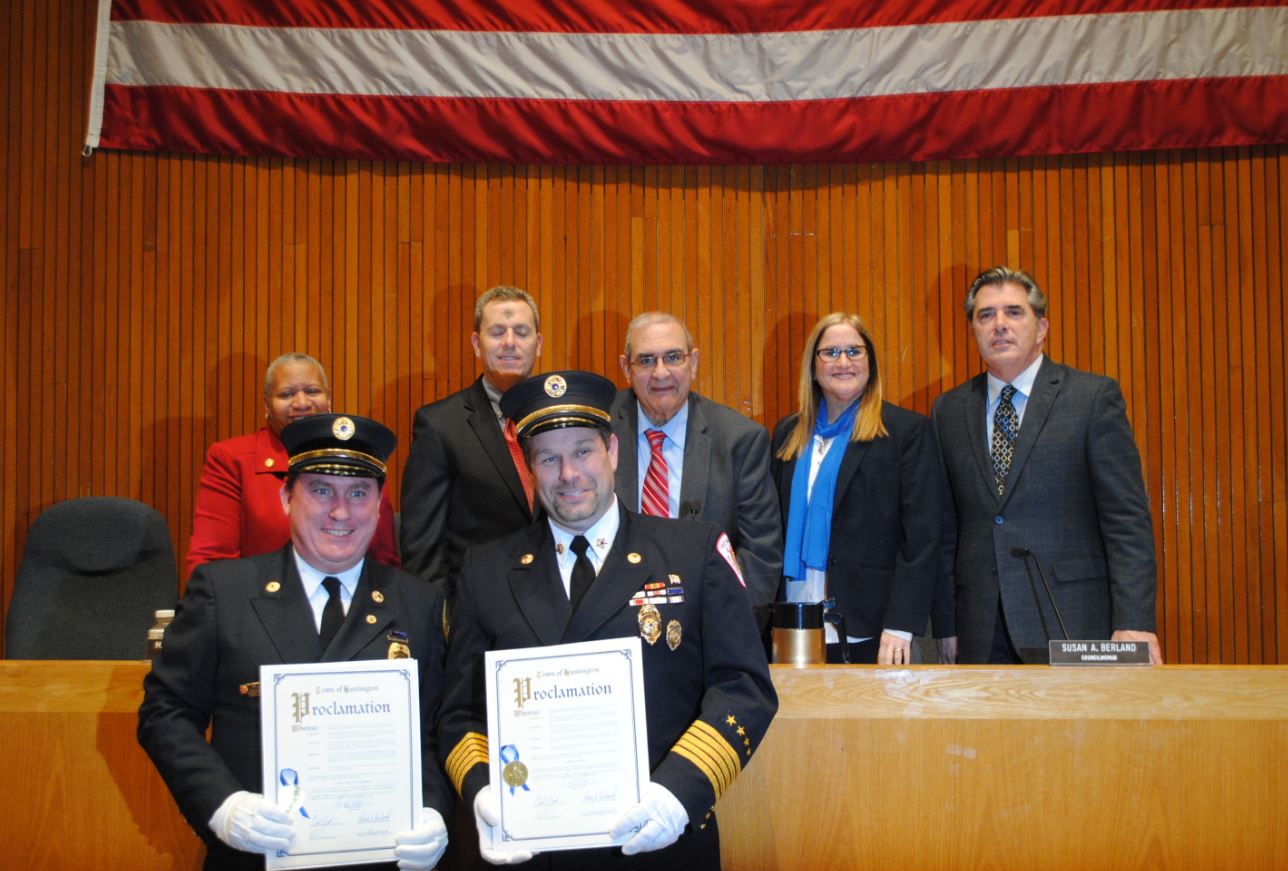 At the February 9, 2016 Town Board meeting, Huntington Supervisor Frank P. Petrone and the Town Council recognized two East Northport Fire Department members who had received the Huntington Chiefs Council’s 2015 “Chiefs of the Year Award” for their for their bravery in attempting to rescue a 90-year-old woman from a house fire.