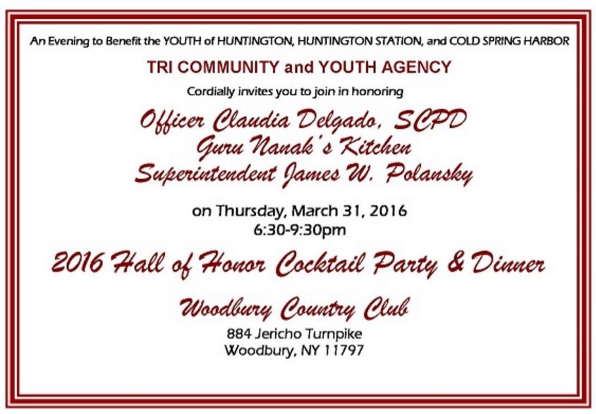 Each year, the Tri-Community Youth Agency (Tri-CYA) holds a fundraising dinner to honor leaders in the community for their unselfish commitment to the youth of Huntington, South Huntington and Cold Spring Harbor. This year’s honorees are: