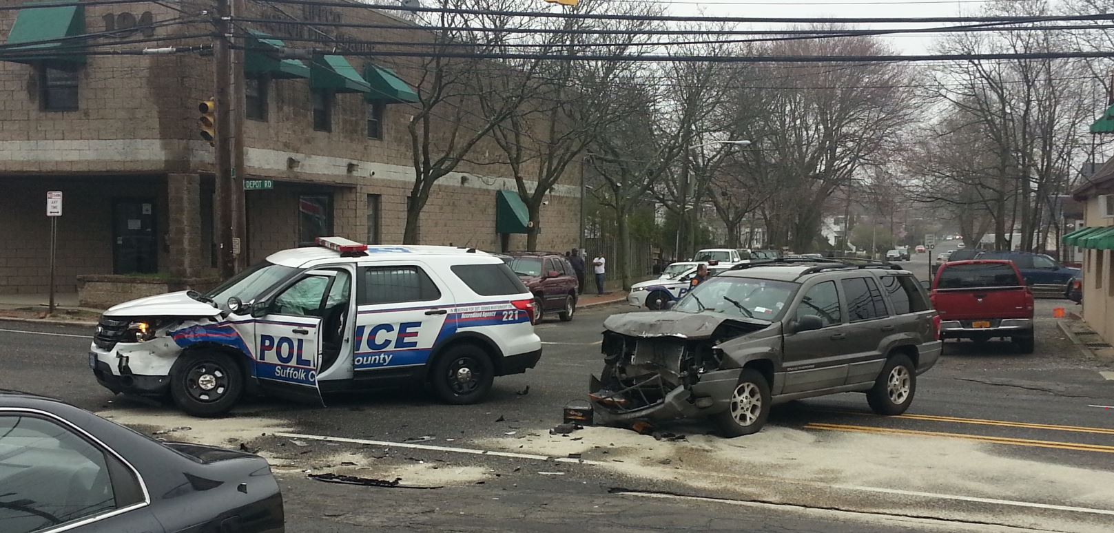 Depot Road is closed because of an accident between a Suffolk County Police SUV on a way to a call and a Jeep, at the corner of Depot Road and 13th Street in Huntington Station today April 1, 2016 around 10:50 am.