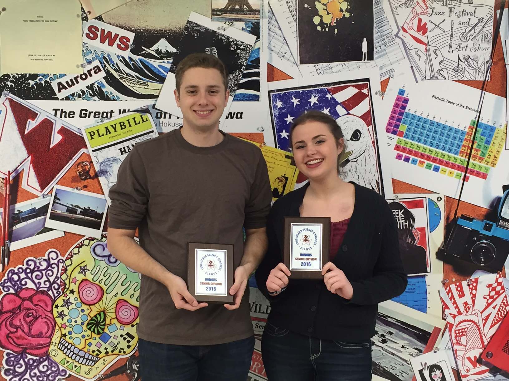 Seniors Grace Franzese and Zachary Wollman jointly won for their project, “Testing the Effectiveness of Alpha Lipoic Acid as an Antioxidant,” in the 2016 Long Island Science Congress competition. They were honored at an awards dinner at the Wheatley School in Old Westbury on May 16, 2016 where they earned the designation of Honors for their project.