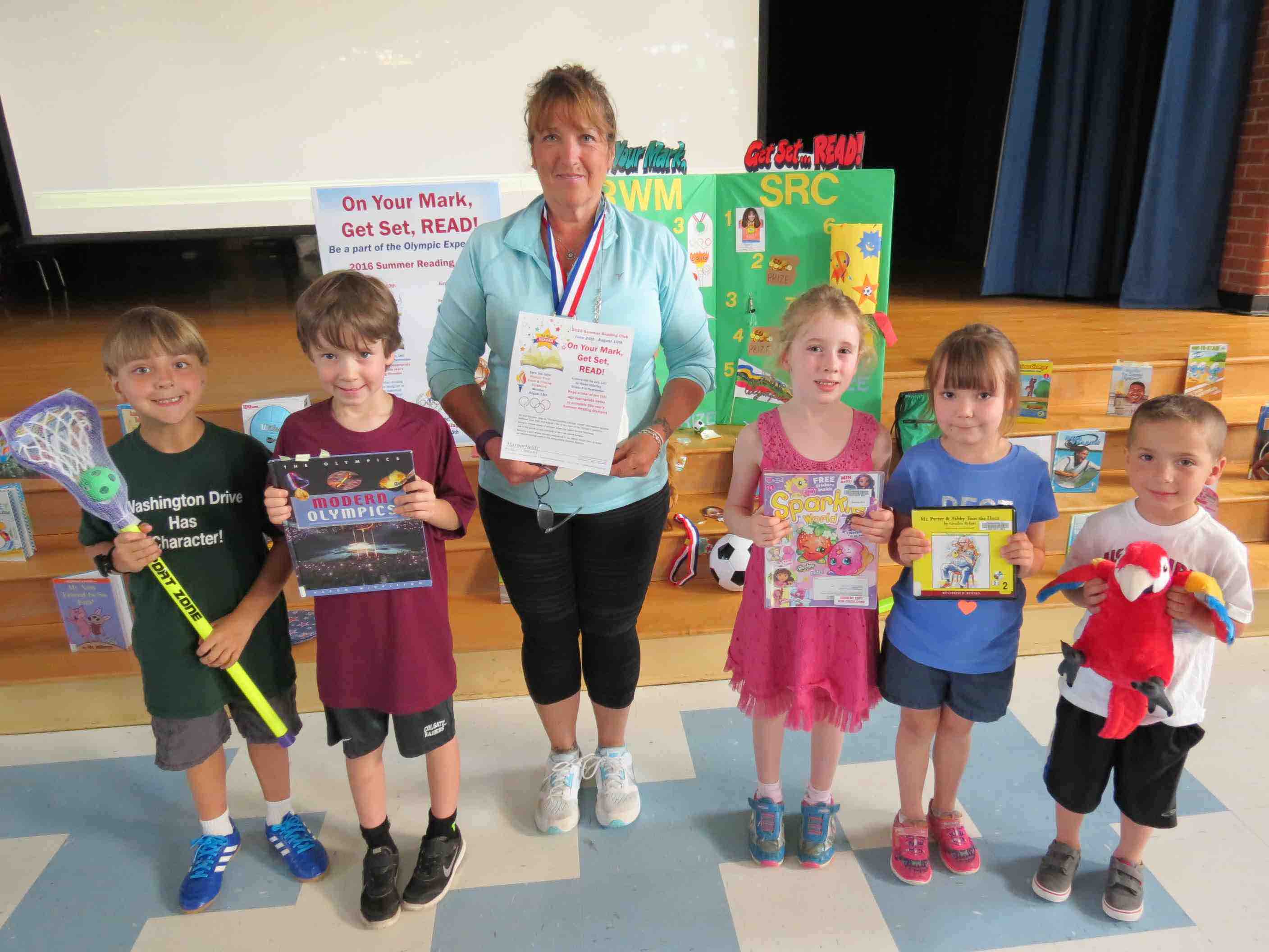 To help encourage and foster a love for reading during the summer months, representatives from the Harborfields Public Library visited the children at Washington Drive Primary School and Thomas J. Lahey Elementary School to share information about the library’s summer reading club. With the theme of this year’s club program inspired by the 2016 Summer Olympics, Harborfields Children Librarian Patricia Moisan brought with her more than 25 books and props that represent the Olympics.