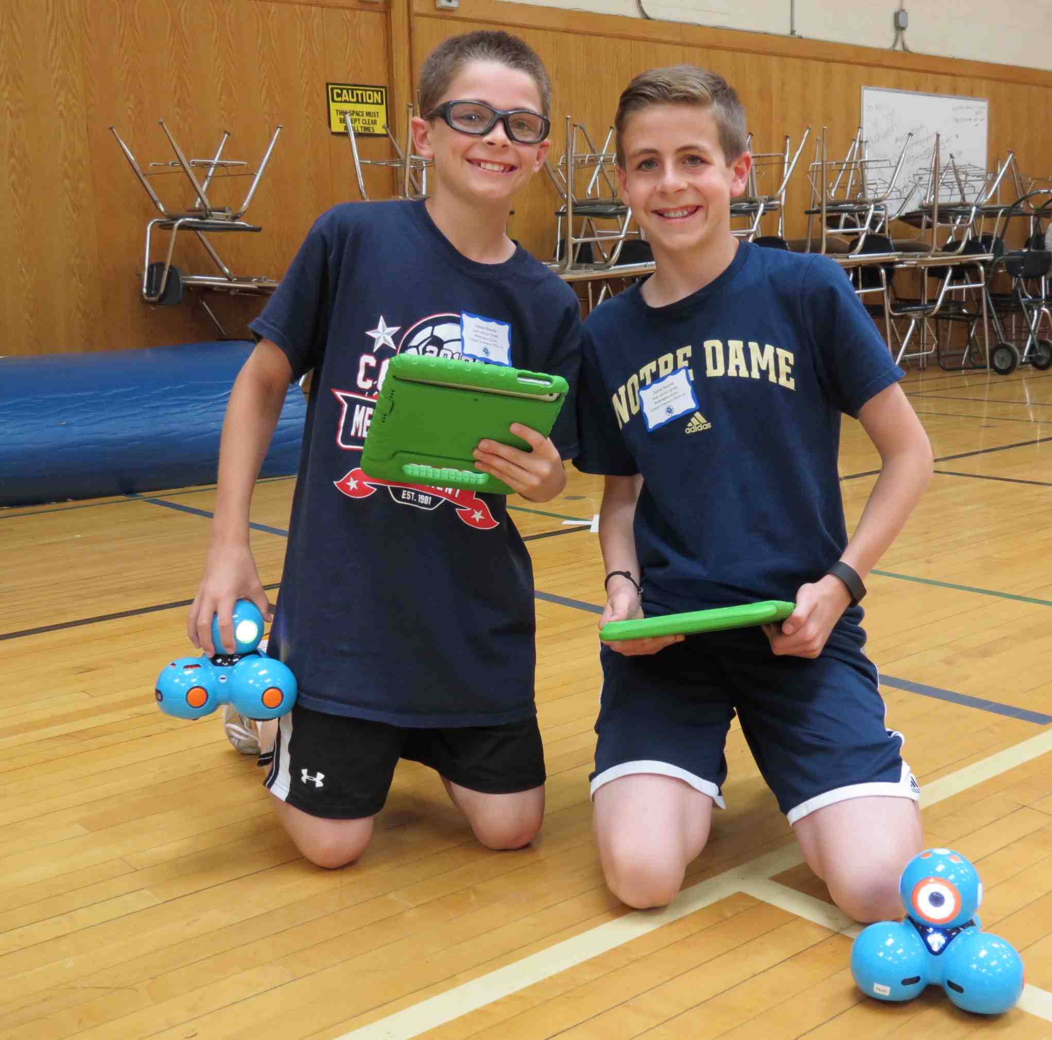 Photo Caption: Elwood students James Rourke and Daniel Rourke enjoyed programing the robots to perform various tricks.