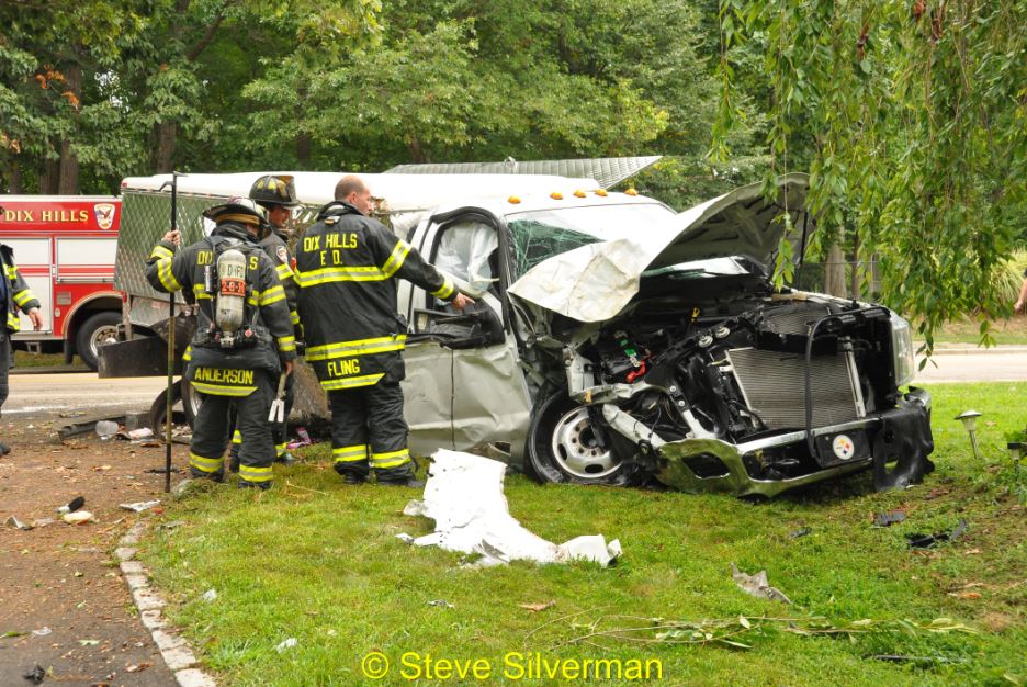 The Dix Hills Fire Department responded to a crash involving a catering truck that struck a tree on Vanderbilt Parkway near Highfield Drive on Saturday, September 3, 2016 at about 11:40 a.m. Firefighters extinguished a small fire in the engine compartment of the truck that was heavily damaged. The driver was not reported injured and declined medical assistance. Two Dix Hills fire engines, an ambulance, paramedic and first responder units were dispatched, under the direction of Chief Robert Fling.