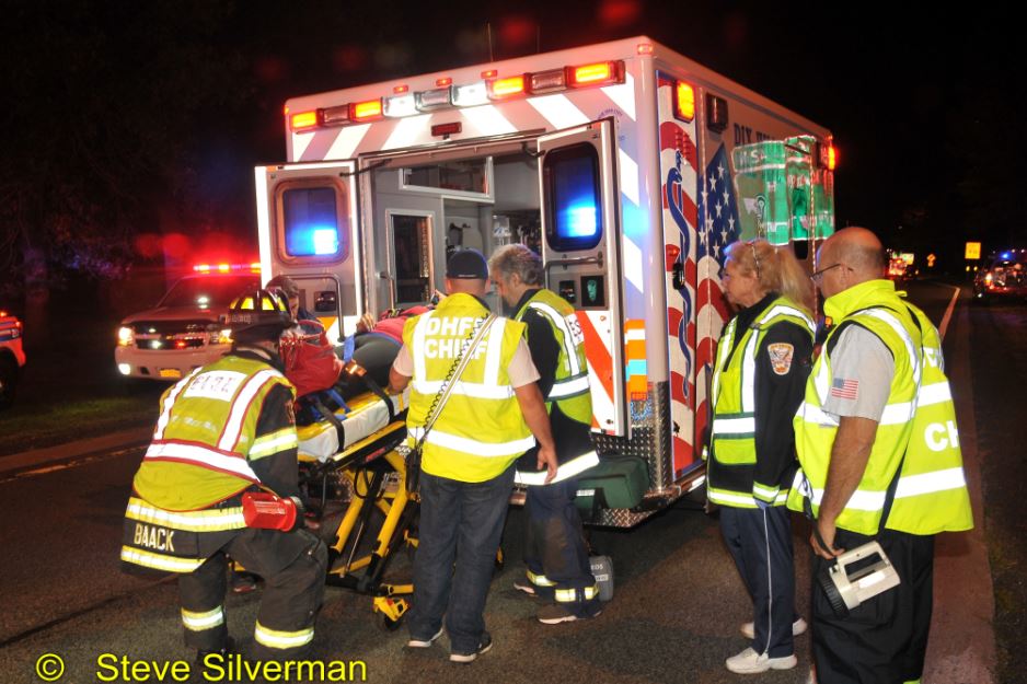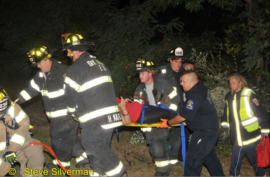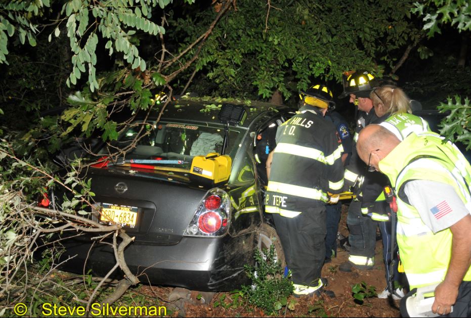 The Dix Hills Fire Department responded to a motor vehicle accident on the Northern State Parkway near the Deer Park Avenue exit on Thursday night, September 15, at about 9:35 p.m. Two vehicles crashed into the woods from the westbound lanes, trapping one of the drivers. Dix Hills firefighters used the “Jaws of Life” heavy rescue tools to cut the door from the car and remove the patient. Both drivers were transported to Huntington Hospital by the Dix Hills Rescue Squad. Over 25 Dix Hills firefighters and emergency medical volunteers were dispatched with two heavy rescue trucks, two ambulances, paramedic and first responder units, under the direction of Assistant Chiefs Tom Napolitano and Joe Williamson.
