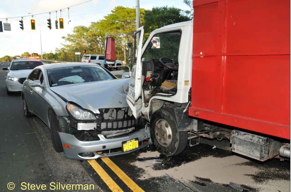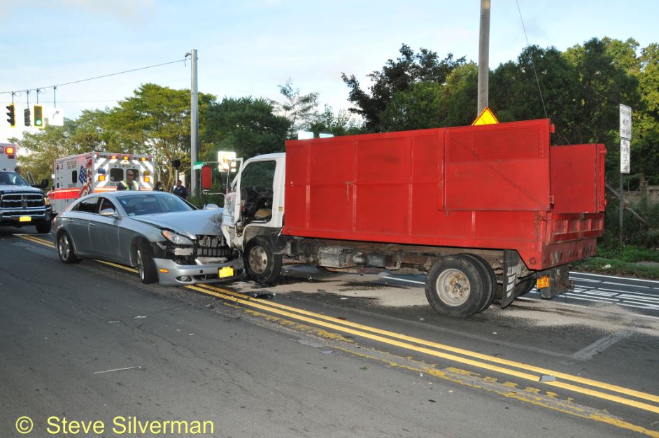 The Dix Hills Fire Department was dispatched to a head-on collision occurring on Carlls Straight Path and the South Service Road on Saturday, September 17, 2016 at about 5:35 p.m. The crash involved a Mercedes-Benz sedan and a landscaping truck. Two occupants of the car suffered non-life threatening injuries and were transported to Good Samaritan Hospital by the Dix Hills Rescue Squad. Two ambulances, a heavy rescue engine, paramedic and first responder units were dispatched, under the direction of Company One Lieutenant Terence Vierling.