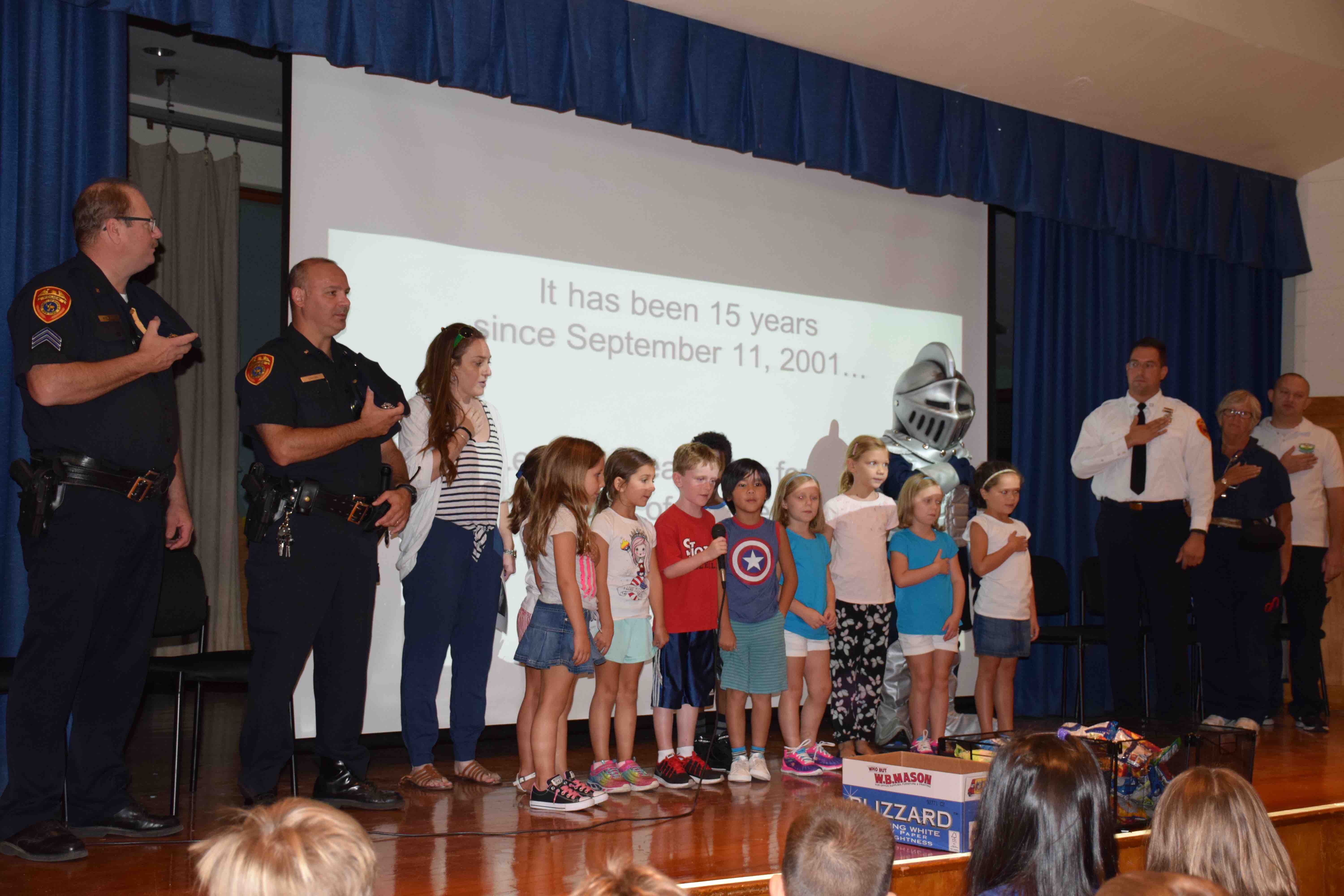 Students dressed patriotically and local first responders were invited to the school. Local Fire Lieutenant Chris Haack, Ambulance Chief Mike Hoddinott, EMT Donna McPartland, Police Sergeant Jerry Romaine and Officer Mike Caponi took the stage while Principal Elissa Toubin introduced them. Superintendent of Schools Dr. Kenneth Bossert joined in the celebration with Assistant Superintendent for Curriculum and Instruction Maureen Hull. The schools mascot, The Harley Knight, made an appearance as well.