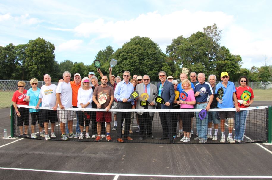 Melville – Huntington Supervisor Frank P. Petrone, joined by Councilmen Mark Cuthbertson and Eugene Cook and players from across the Town, officially opened the Town’s first dedicated pickleball courts at Whitman Park September 27, 2016.