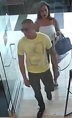 A man and woman both entered Sunglass Hut in the Walt Whitman Mall with a pair of sunglasses. The pair both took more expensive sunglasses, and replaced them in the display with their old sunglasses.