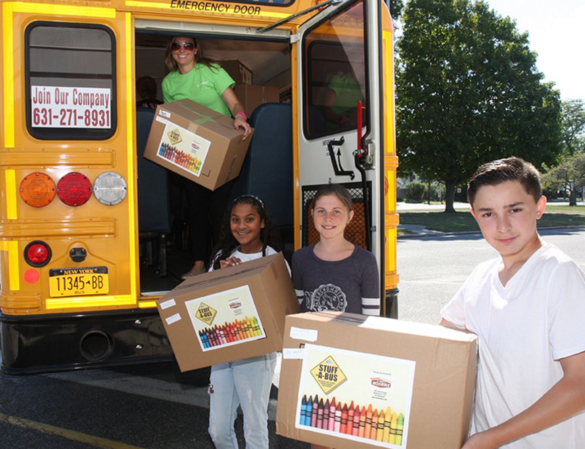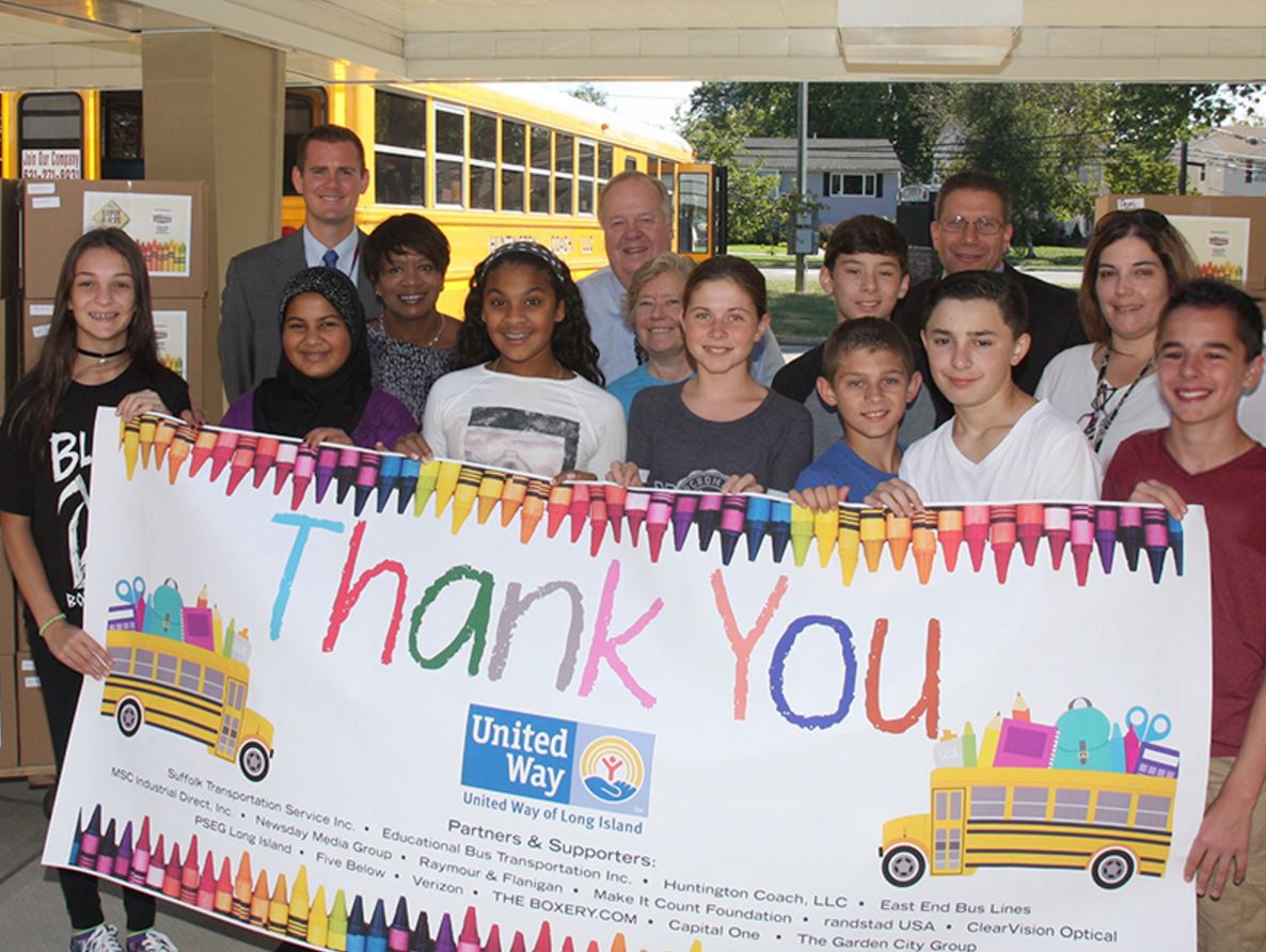 The spirit of community service was in full force recently as the generous members of the United Way teamed up with Huntington Coach and volunteers to donate a busload of school supplies for our South Huntington children. There was a special feeling of cooperation in the air at Stimson Middle School as students from the Student Government formed an assembly line to unload the countless boxes of school bags, books, markers, writing tablets, pencils, pens, and more that filled the full-size bus.