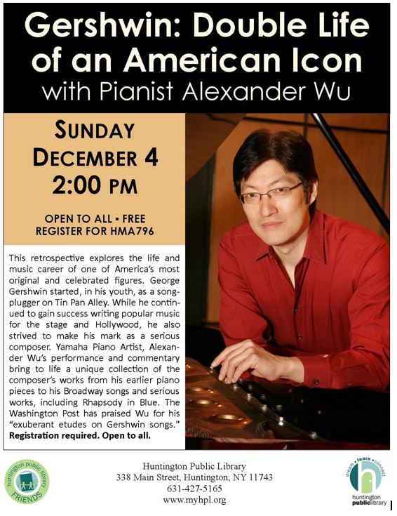 This retrospective explores the life and music career of one of America’s most original and celebrated figures. George Gershwin started, in his youth, as a song-plugger on Tin Pan Alley. While he continued to gain success writing popular music for the stage and Hollywood, he also strived to make his mark as a serious composer. Yamaha Piano Artist, Alexander Wu’s performance and commentary bring to life a unique collection of the composer’s works from his earlier piano pieces to his Broadway songs and serious works, including Rhapsody in Blue. The Washington Post has praised Wu for his “exuberant etudes on Gershwin songs.” Open to all. Call 631-427-5165 to register.