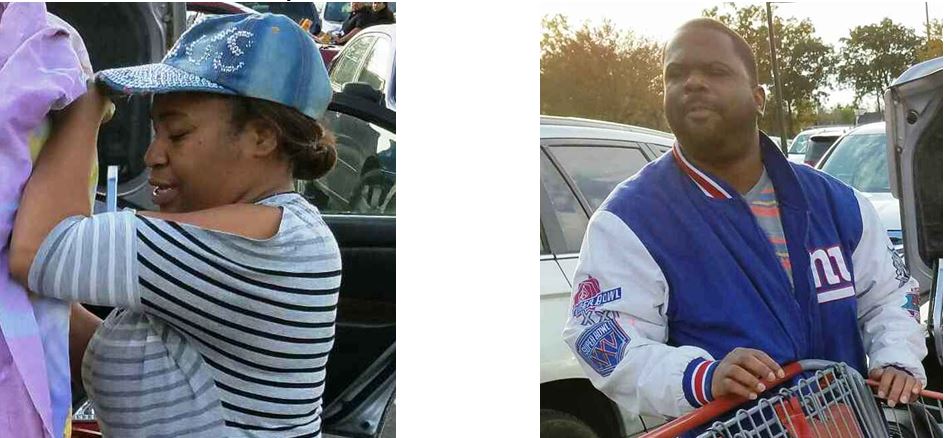 The male was described as black, approximately 6 feet 1 inch tall, in his mid-30s, with a stocky build. He was wearing dark jeans and a New York Giants jacket. The female was described as black, approximately 5 feet 6 inches tall, in her mid-30s, with a medium build. She was wearing a gray and black striped shirt with light-colored jeans and a blue baseball hat. They fled in a silver Acura sedan.