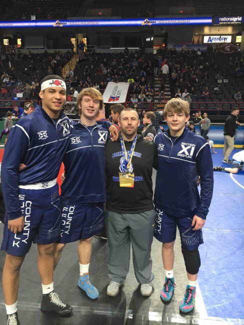 Photo Above: (From left to right) Elwood-John H. Glenn High School senior Damien Caffrey, junior Joe Franzese, wrestling coach T.J. Brocking and senior Zach Ancewicz at the New York State Wrestling Tournament.