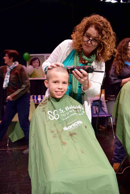 Local barbershops and salons volunteered their time and skills to shave heads. Banzer and eight-year-old Northport-East Northport cancer survivor Christian Sloan cut the green ribbon to kick off the event. Sloan overcame anaplastic ependymoma, also known as a brain tumor and helped shave volunteers’ heads during the event.