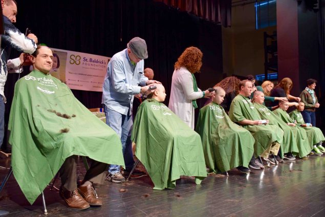 One by one, team members of all ages sat in chairs on the auditorium stage and had their heads shaved for the cause, while the Northport Pipe and Drums entertained the crowd with their bagpipe performance.