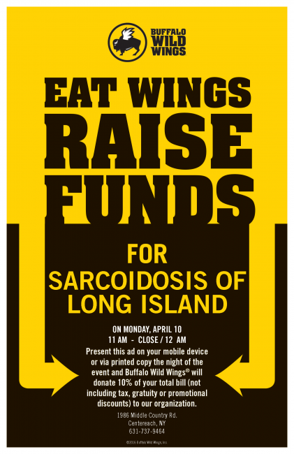 Present this ad on your mobile device or via printed copy the night of the event and Baffalo Wild Wings will donate 10% of your total bill (not including tax, gratuity or promotional discounts) to our Organization Sarcoidosis of Long Island.