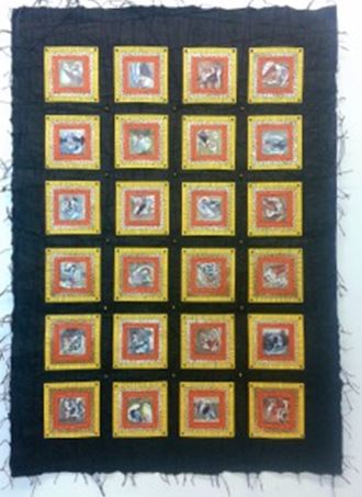 Exhibited here are pieces from her Jharokha Series. Jharokha is an overhanging enclosed balcony used in the Architecture of Rajasthan (India).  It served as decoration and it allowed women to view the outside without being seen.  Mittal’s art combines the rich culture of her homeland and incorporates her adapted western lifestyles. Searching and defining her identity through her materials and her process.  She integrates the basic forms of Warli Painting, ajrakh block printing, lattice work, and other forms of traditional Indian painting. “The vibrant organic colors and integrated motifs are reinterpreted to represent culturally diverse and distinct varieties of art forms that have evolved over the years.” says Mittal.
