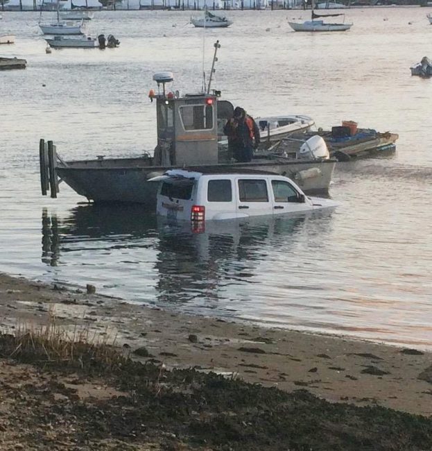 The Huntington Fire Department was dispatched for a vehicle into Huntington Harbor on West Shore Road near Gold Star Beach, Saturday morning, April 8, 2017 at about 6:40 a.m. Huntington firefighters responded with their heavy rescue truck and zodiac boat, and searched the water and SUV for any possible victims. The driver was not reported injured and was found at his nearby home by Suffolk Police. Huntington FD units were under the command of Chief Jesse Cukro and Assistant Chiefs Brian Keane and Scott Dodge.