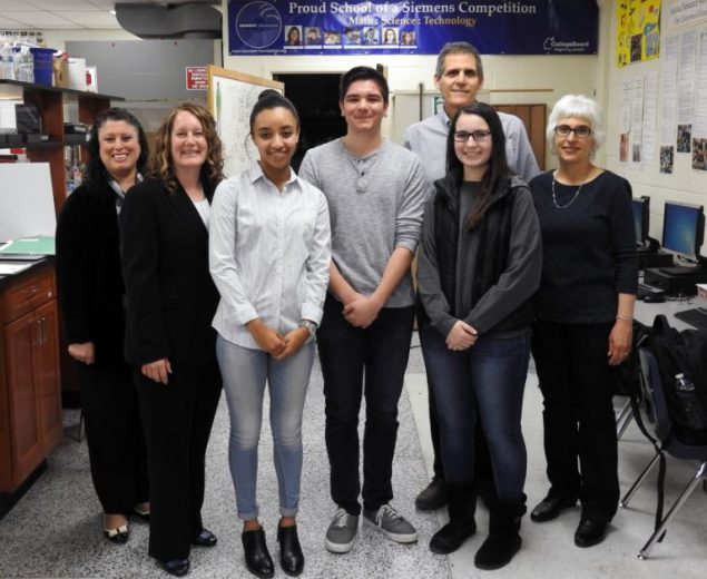 In photo, from left to right: Commack High School Principal Leslie Boritz, Science Director Dr. Alison Offerman Celentano, Charity, Raphael, Abby, Science teachers and mentors Richard Kurtz and Dr. Lorraine Solomon.