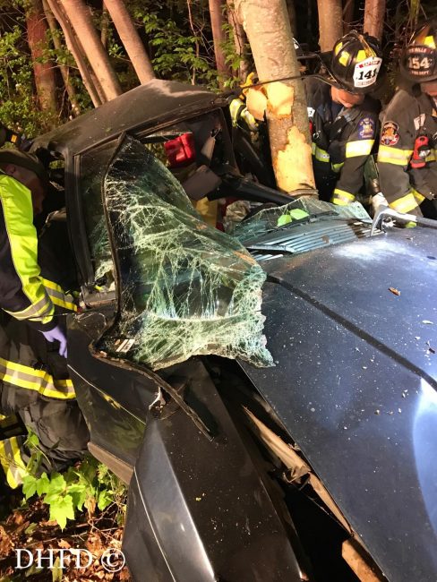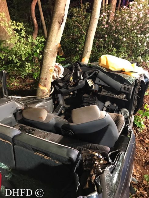 The Dix Hills Fire Department responded to a crash on the Northern State Parkway, eastbound between the Deer Park Avenue and Commack Road exits, just after 3 a.m. on Thursday, May 18, 2017. Dix Hills firefighters used heavy rescue extrication tools to remove the driver who was trapped after the car struck a tree. Firefighters removed the roof, doors, and pushed back the dashboard to free the driver.