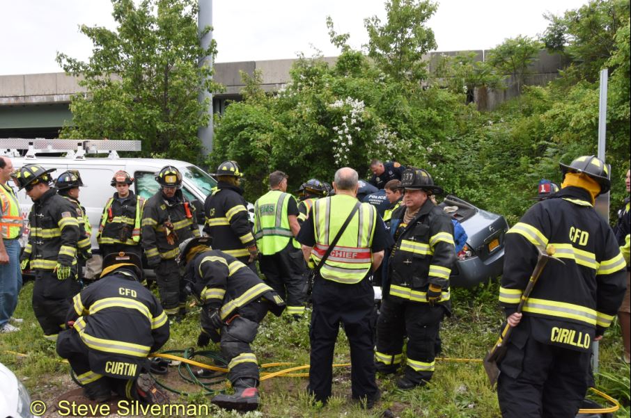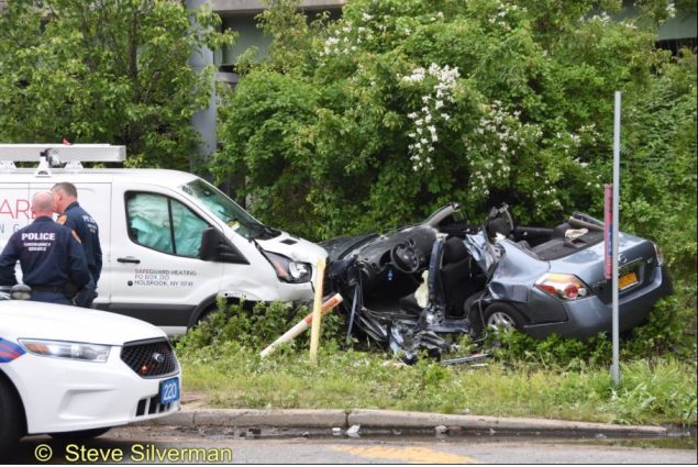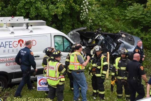 The Dix Hills Fire Department, Commack Fire Department, Commack Volunteer Ambulance Corps and Suffolk Police responded to this crash on the North Service Road at Commack Road on Sunday, May 28, 2017 at about 5:20 p.m. Firefighters and Police emergency services worked together using heavy rescue tools to remove three victims trapped in the car involved in a crash with a van.