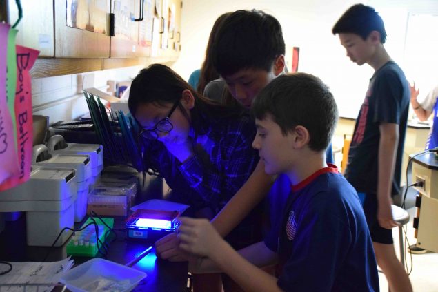 The classes were introduced to SYBR Green, a special gel that dyes the DNA, allowing it to be seen and glow under an ultraviolet light. Students took turns analyzing their DNA under the light with their peers and recording their results.