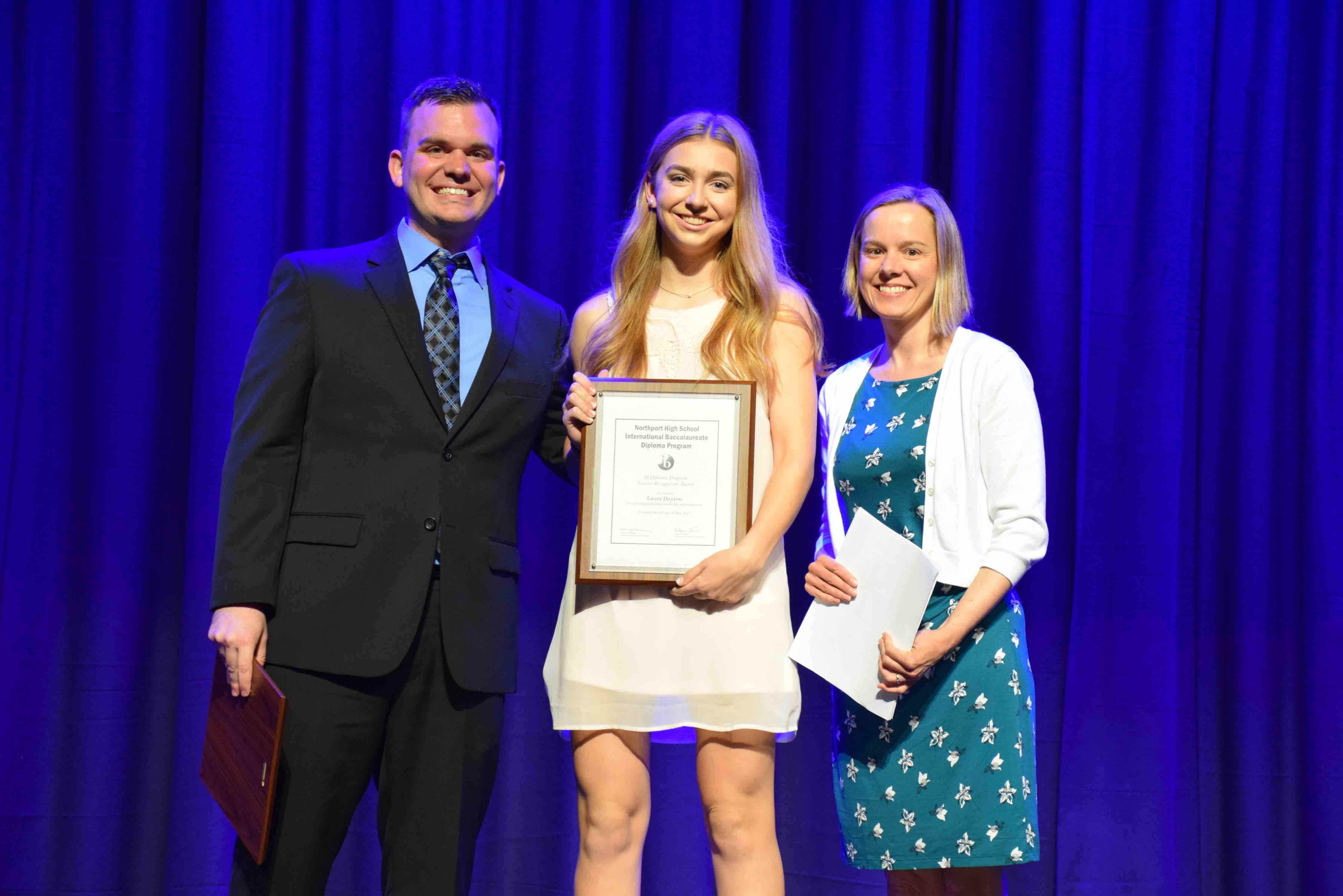 2) Laura Dayton received the IB Diploma Program Teacher Recognition Award from IB Diploma Program Coordinator Wayne Jenson and teacher Kristen Rozell.