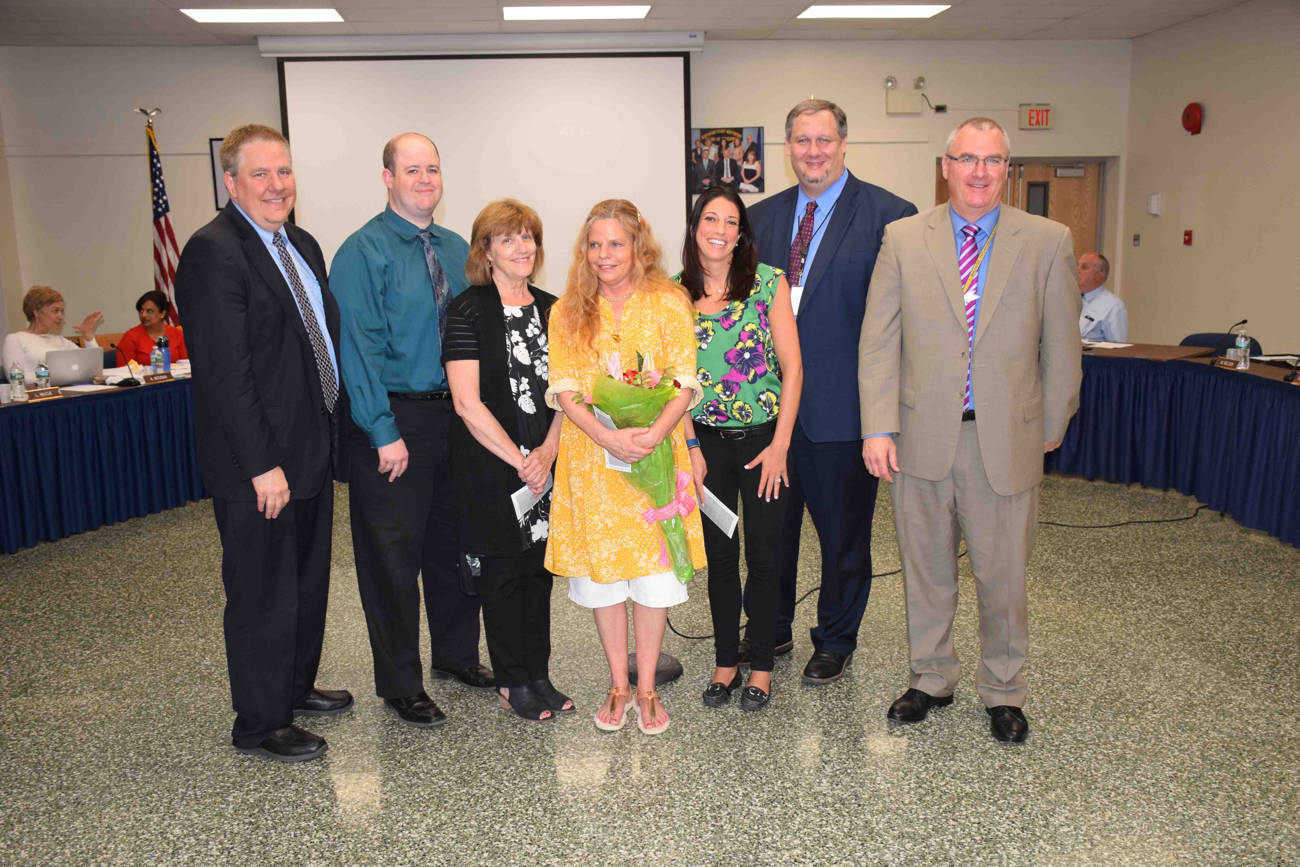 5) Board of Education trustees Jennifer Thompson (left center) and Regina Pisacani (right center) were honored for their years of service to the community by members of the Board of Education and Superintendent of School Robert Banzer.