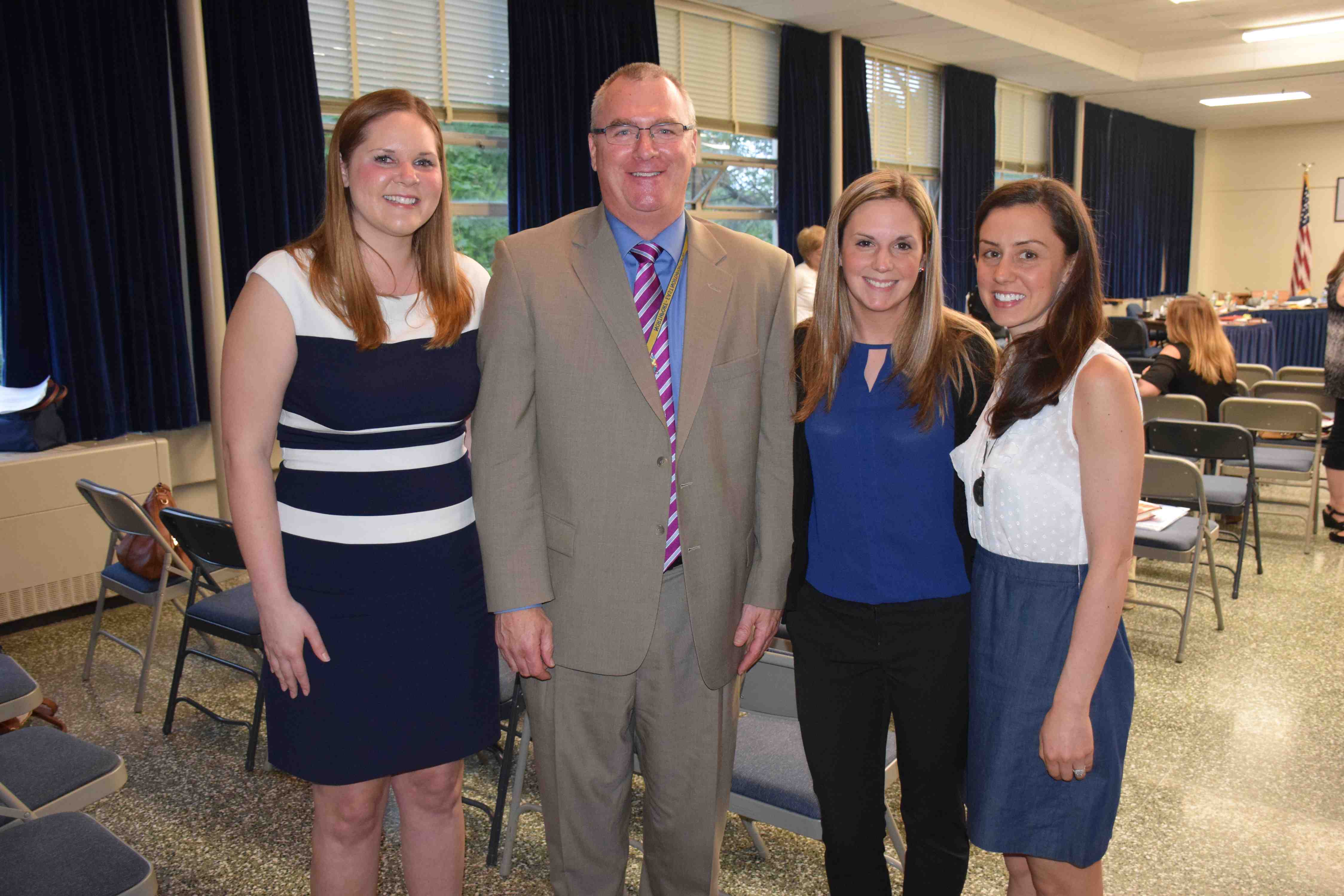 6) Superintendent of Schools Robert Banzer (left center) congratulated Northport High School English teacher Kerri Tordi (left), Dickinson Avenue Elementary School teacher Erin Harrison (right) and Amy Lang (right center), Ocean Avenue Elementary School teacher for receiving tenure.