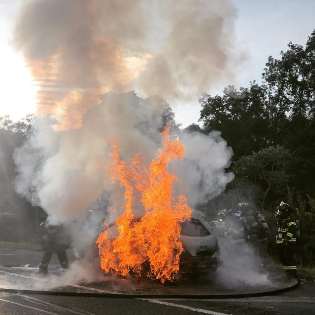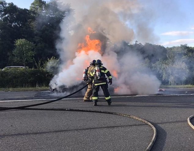 The Dix Hills Fire Department responded to a car fire on the Long Island Expressway in the westbound lanes, just west of Commack Road at around 7pm on July 4, 2017. Three engines and two ambulances were dispatched and under the direction of Assistant Chiefs Joe Williamson and Brett Tepe. Firefighters used 750 gallons of water and foam to extinguish the blaze, which was intensified when the gas tank ruptured. There were no injuries reported.