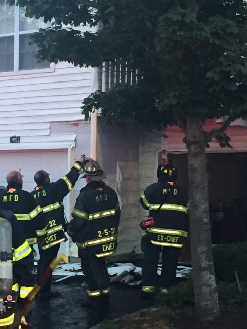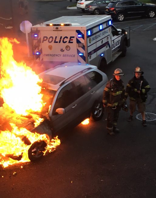 The Melville Fire Department responded to reports of a car fire at the Avalon Court Apartments on Court North Drive, on Wednesday, August 9, 2017. at about 7:40 p.m. First arriving units found an active fire in a car parked up against the garage of the Avalon complex. Three trucks, three ambulances and a paramedic responder were dispatched with 25 fire/rescue personnel.