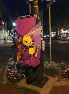 Late last month, William Low’s Tacking off the Cape was installed on the signal box at the southeast corner of Main and New Streets in Huntington Village and Monica Chulewicz’ The Healing When The Sky Opens Up was placed on a box at Depot Road and East 13th Street in Huntington Station, the first in that community.  Last week, another Low work, Bumblebee, was installed on the northwest corner of Main and Clinton Streets, and Jack Pierce’s Flowers was placed on the box at the southwest corner of Main Street and New York Avenue.