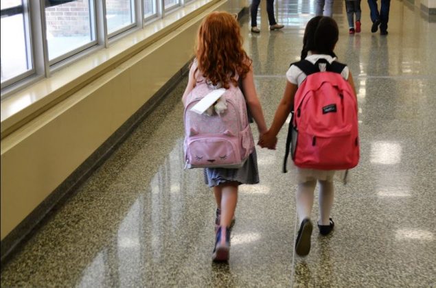 Students at Harley Avenue Primary School sticking together on the first day.