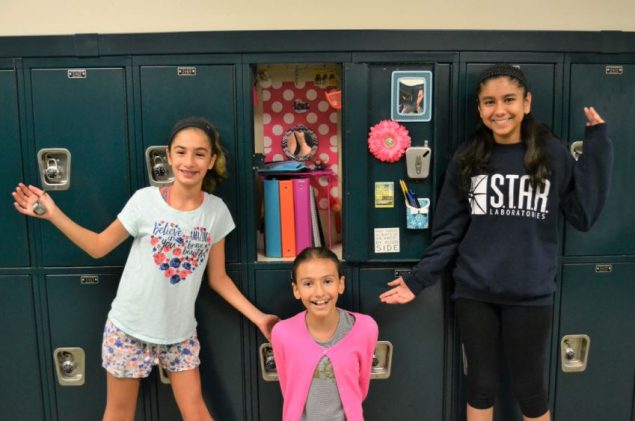 Seventh graders Gabby Dimartino, Alexa Palacios and Arya Sharma set up their lockers at Oldfield Middle School.