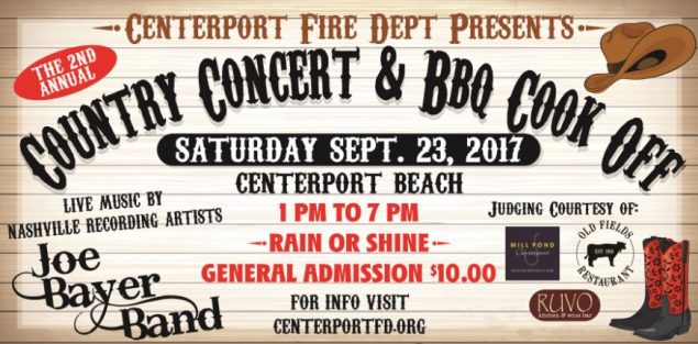 The Centerport Fire Department is proud to present their second annual Country Concert and Barbecue Cook-Off on Saturday, September 23, 2017, from 1pm – 7pm at Centerport Beach. The concert features live Country Music by the award winning Nashville recording artists “Joe Bayer Band,” one of the nation’s top rated Country Music Bands. Joe Bayer received the “Entertainer of the Year” and “Touring Band of the Year” awards by Country Blast Radio in Nashville, Tennessee last year. Barbecue Cook-Off teams will be competing for bragging rights on the best chicken, beef and pork ribs.