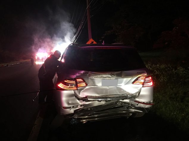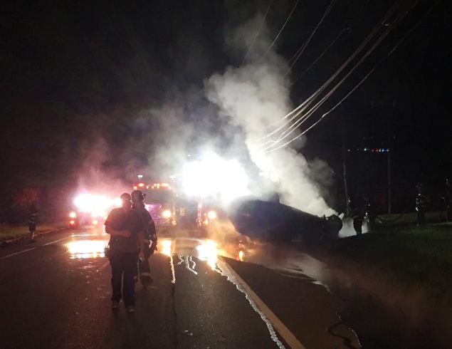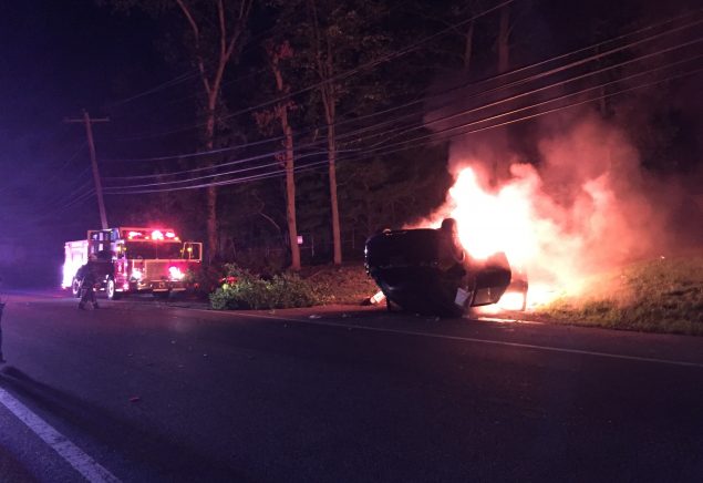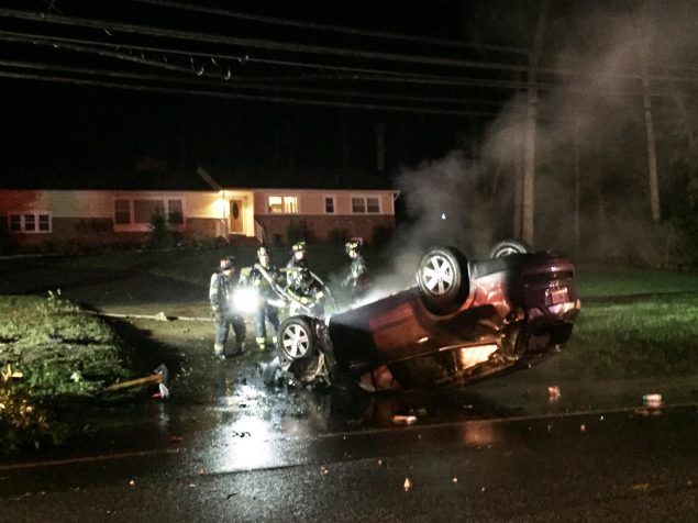 Melville Fire Department volunteers responded to a motor vehicle accident with a car fire on Bagatelle Road near Tamara Court on Sunday, October 1, 2017 at about 5:15 a.m. The two-vehicle crash involved a car that struck an SUV an overturned, setting the car on fire. The occupants of the car were able to self-extricate from the overturned wreck, and two victims were transported to Huntington Hospital by the Melville Rescue Squad with head injuries. The driver of the SUV declined medical assistance. Two ambulances, two engines, and a paramedic unit were dispatched and under the direction of Assistant Chiefs Chris Nolan, David Kaplan and Bill Schmitt.