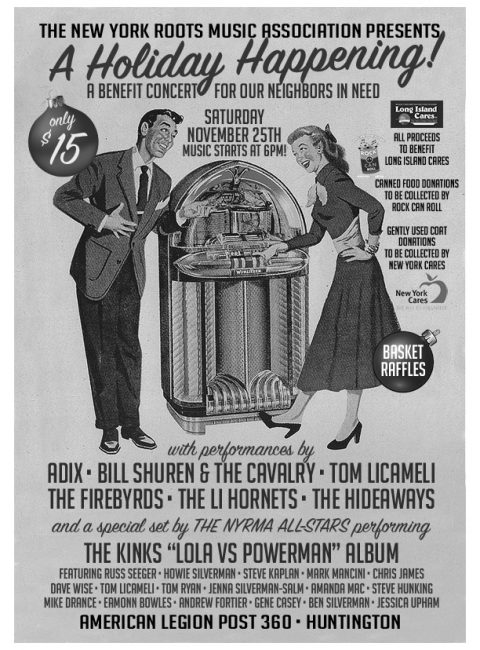 Only $15 Saturday November 25, 2017 at American Legion Post 360 -NY Ave- Huntington, NY 6pm. This is a benefit concert for our neighbors in need. Proceed to benefit “Long Island Cares”