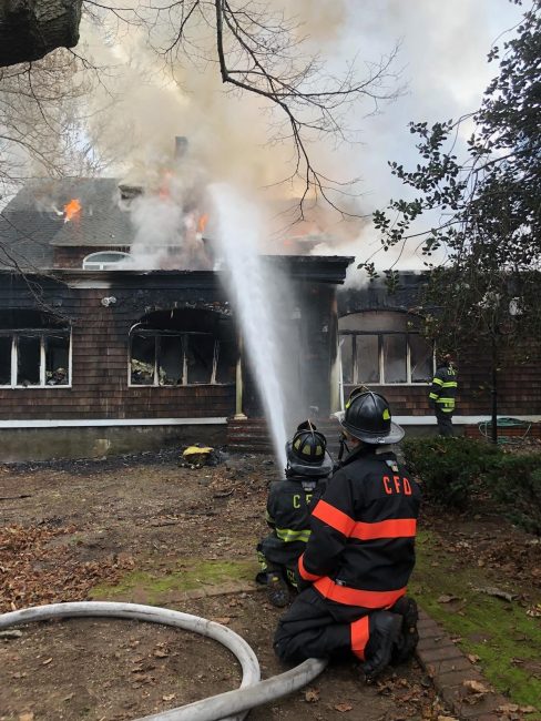 At approximately 11am on December 22, 2017, the Halesite Fire Department was activated for a reported basement fire in the historical Bay Crest section of Huntington Bay.  Upon arrival, first due units requested reactivation of the alarm and mutual aid assistance for a fully involved working structure fire in an 8,000 square-foot mansion.  Fire was venting on nearly all windows throughout the first floor, with hot pressurized smoke venting from upper floors.  The Huntington Bay Police Chief was on scene and informed the FD units that the structure was empty with no occupants, and the mansion had a very hot and rapidly growing fire on the first and second floors.