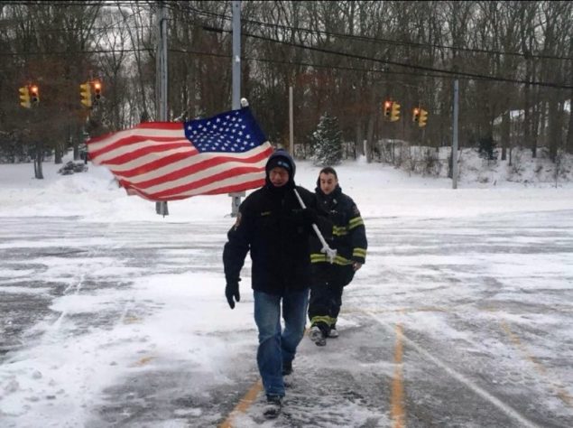 Firefighters at headquarters on Deer Park Avenue noticed that the strong winds broke the bracket of an American Flag across the street from the firehouse, and the flag was hanging upside down in distress and about to blow away in the storm. Firefighters Marc Ligator (carrying flag) and Chanan Schupak braved the elements and ran across the street and rescued the flag, which was brought back to the firehouse for safekeeping and later returned to the homeowner.