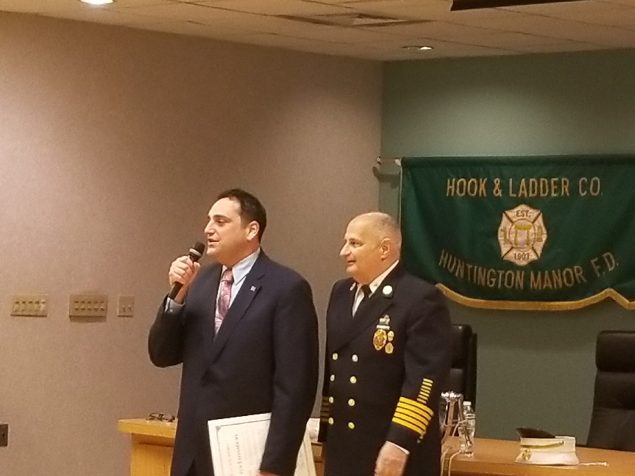 Huntington Supervisor Chad A. Lupinacci joined in the ceremony January 15 honoring Huntington Manor firefighter Louis Agiesta for 50 years of service to the department, including a term as chief.