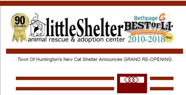 The Town of Huntington Cat Shelter is a no-kill municipal animal shelter managed by Little Shelter Animal Rescue and Adoption Center, a non-profit registered 501(c)(3). Huntington’s cat shelter provides shelter, medical treatment and adoption to the homeless cats in the town. All pets are spayed/neutered, vaccinated and micro-chipped before being placed into loving homes.