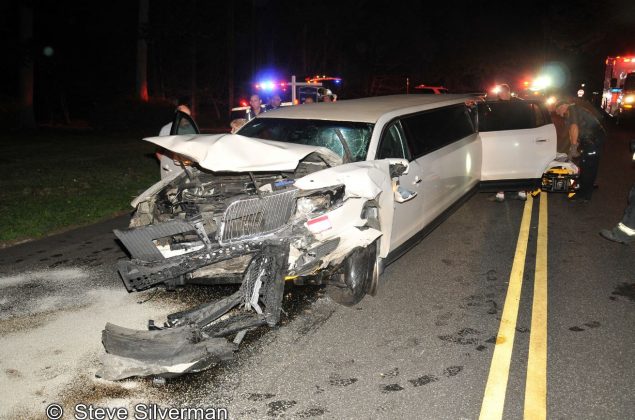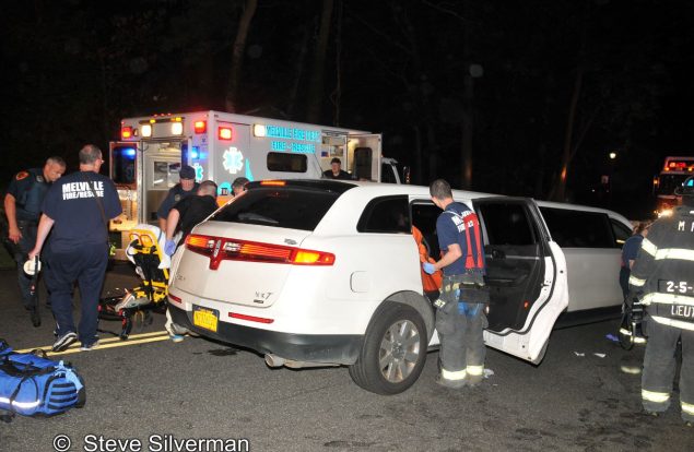 The Melville Fire Department responded to a head-on crash involving a Lincoln Limousine and a Mercedes Benz sedan on Wilmington Drive near Chiswell Drive on Sunday, July 1, 2018, at around 1:38 a.m. The driver and five passengers in the limo suffered injuries, and were treated and transported to the Nassau University Medical Center and Huntington Hospital. Rescue Squad ambulances from the Melville Fire Department, with assistance from the Dix Hills Fire Department and Plainview Fire Department transported the victims. About 35 fire/rescue personnel were on the scene with seven ambulances, an engine, paramedic and first responder units, under the direction of Assistant Chiefs David Kaplan and Jason Bernfeld.