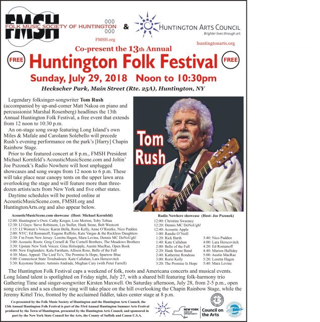 Legendary folksinger-songwriter Tom Rush (accompanied by up-and-comer Matt Nakoa on piano and percussionist Marshal Rosenberg) headlines the 13th Annual Huntington Folk Festival on Sunday, July 29, at Heckscher Park, located off Main Street (Route 25A) and Prime Avenue, in Huntington Village. Extending from 12 noon to 10:30 p.m., the free event – co-presented by the Folk Music Society of Huntington and the Huntington Arts Council – is part of the 53rd Huntington Summer Arts Festival.