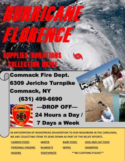 The Commack Fire Department is hosting a Collection Drive to collect goods for our neighbors to the south who we are anticipating will be in need of supplies after the devastation caused by Hurricane Florence. **No Clothing Please**