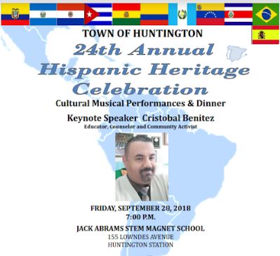 Officials from the Town of Huntington and the Hispanic Task Force will be joined by Suffolk County officials; community leaders, including keynote speaker Cristobal Benitez; local school districts and students at the 24th Annual Hispanic Heritage Celebration taking place at the Jack Abrams STEM Magnet School, located at 155 Lowndes Avenue, Huntington Station, on Friday, September 28, 2018 at 7pm.