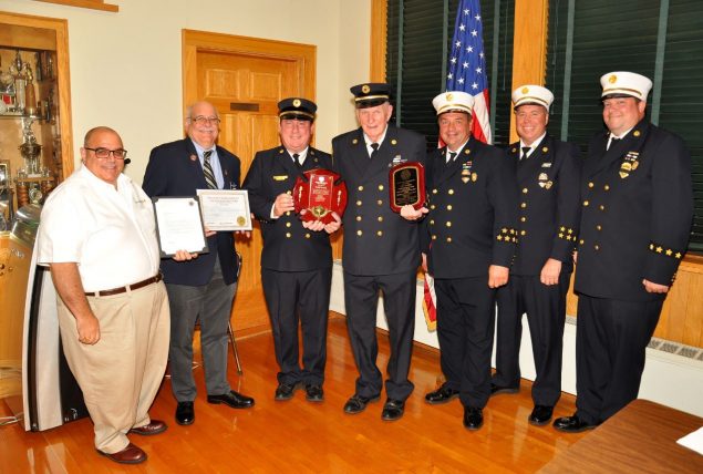 Awards Photo – Presenting awards from left, are NYS Fire Chiefs Director Anthony LaFerrera, FASNY Director Gene Perry, Huntington Chiefs Council President Dan McConnell, Ken Klerk, Chief Tom Boyd, First Assistant Chief Rich Miltner and Second Assistant Chief Andrew Heglund. (Photo by Steve Silverman)