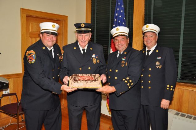 The Centerport Fire Department recently recognized Ex-Chief Ken Klerk for his 70 years of dedicated service as a volunteer firefighter and EMT. Klerk joined the department in 1948, advanced through the officer’s ranks and served as Chief of the Department from 1968-1969. He was also a Fire Commissioner from 1970-1990, Captain of the Fire Police, Centerport Rescue Squad member for over 25 years and one of the first EMT’s in Suffolk County. Klerk received awards from the Town of Huntington Fire Chiefs Council, Suffolk County Fire Chiefs Council, NYS Association of Fire Chiefs, Firemen’s Association of the State of NY (FASNY), Governor Andrew Cuomo and Suffolk County Executive Steve Bellone. Klerk was also presented with an anniversary cake by the Chiefs that was shared with the membership.