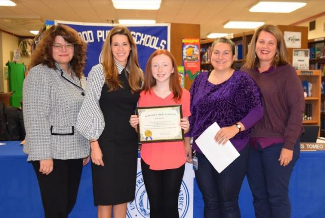 At Elwood Union Free School District’s most recent Board of Education meeting, middle school student Erin Kenny was recognized for being selected as one of the winners of Harry Potter’s 20th Anniversary Scholastic Writing Contest.